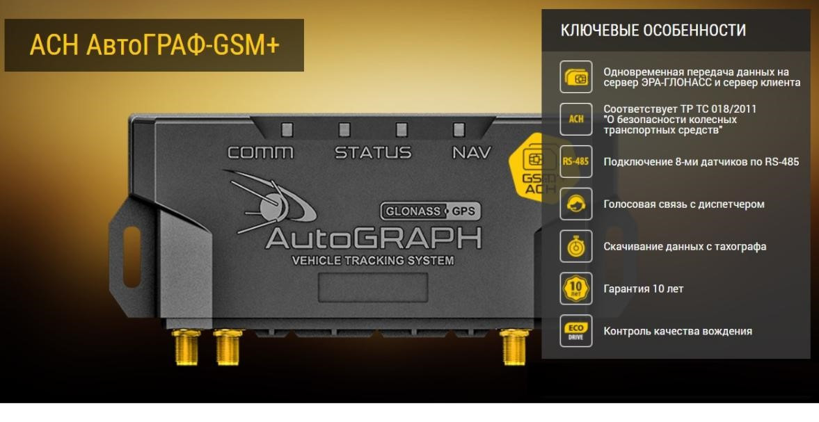 Аппаратура спутниковой навигации (АСН) «АвтоГРАФ» – это аппаратно-программное устройство, устанавливаемое на транспортное средство для определения его текущего местоположения, направления и скорости движения по сигналам не менее двух действующих глобальных навигационных спутниковых систем (ГНСС), обмена данными с дополнительным бортовым оборудованием, а также для обмена информацией по сетям подвижной радиотелефонной связи, предназначен для оснащения колесных транспортных средств категории М, используемых для коммерческих перевозок пассажиров, а также специально предназначенных для перевозки детей, и категории N, используемых для перевозки опасных, специальных, тяжеловесных и (или) крупногабаритных грузов, твердых бытовых отходов и мусора c учетом требований, установленных в ТР ТС 018/2011 «О безопасности колесных транспортных средств.
